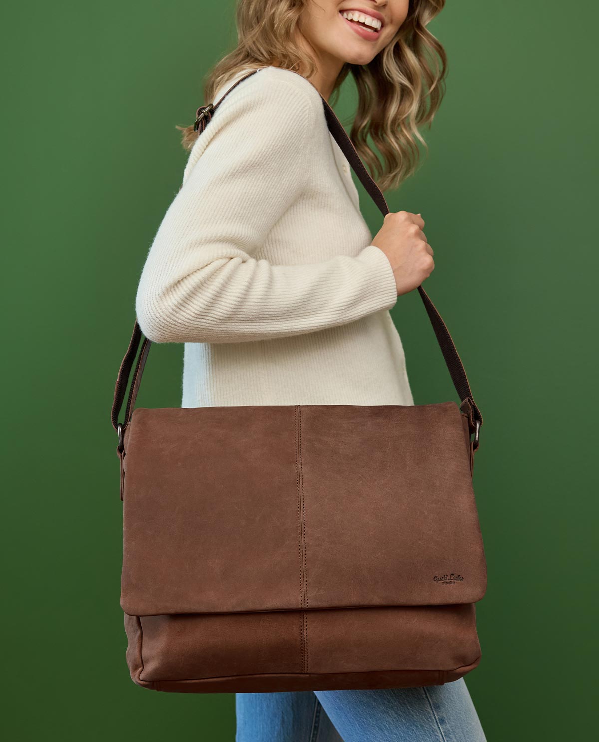 Unsere Umhängetasche ist aus hochwertigem, robustem Leder gefertigt. Das strapazierfähige Material gewinnt mit der Zeit an Charakter und entwickelt eine einzigartige Patina. Jede Tasche ist handgefertigt und besitzt ihre eigenen individuellen Merkmale, wodurch sie zu einem einzigartigen Unikat wird. Die braune Farbe verleiht der Tasche einen authentischen Vintage-Look, der zu jedem Outfit perfekt passt. Zudem bietet die Tasche ausreichend Stauraum: Das Hauptfach ist groß genug für ein Tablet, ein Notebook oder wichtige Unterlagen. Zwei Innenfächer und eine Reißverschlusstasche sorgen für Ordnung, während der verstellbare Schultergurt für optimalen Tragekomfort sorgt – ob lässig über der Schulter oder quer über den Körper getragen.