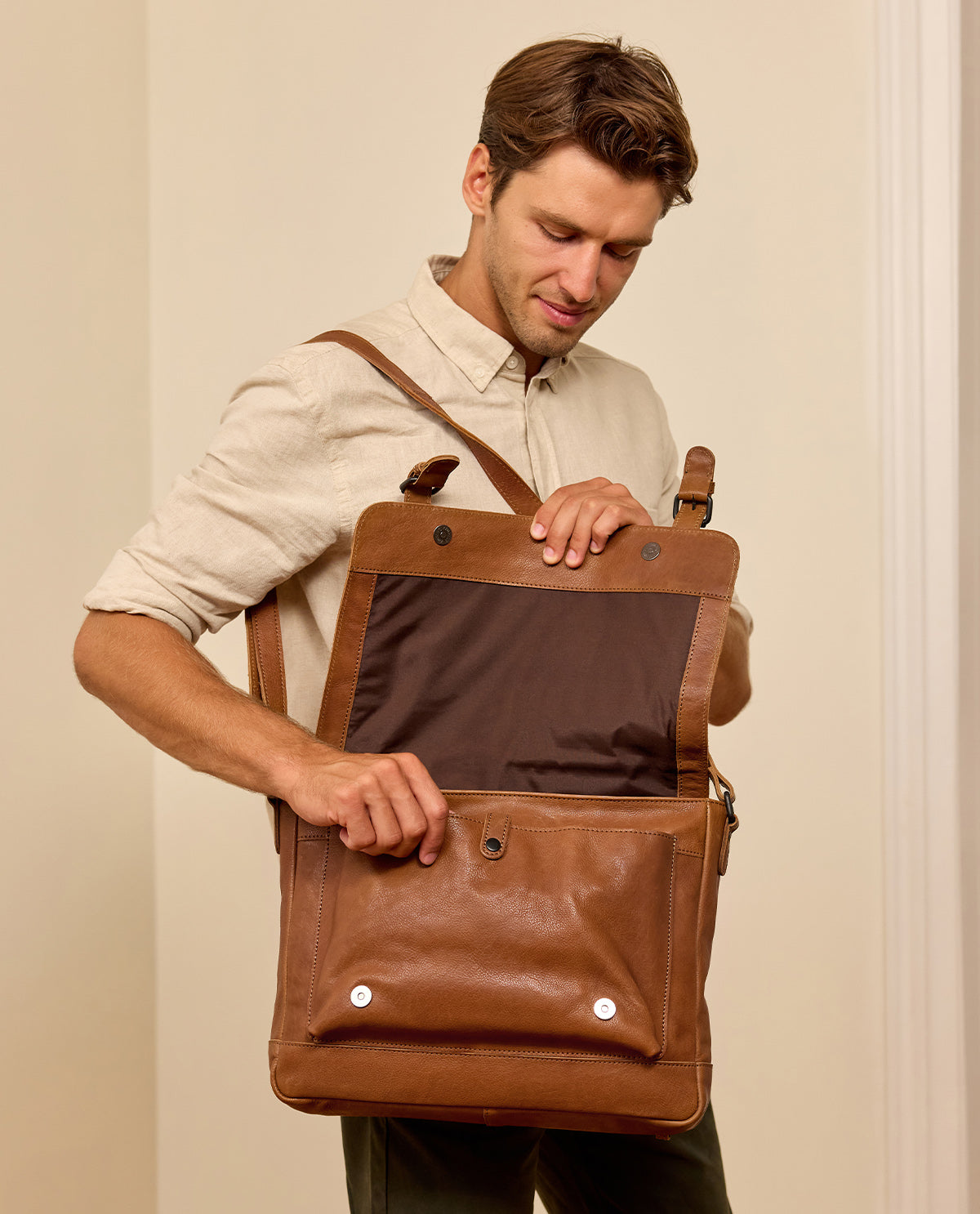 The "Attila" laptop bag made of high-quality leather is the perfect companion for your workday. It combines modern design with thoughtful functionality to transport your valuable devices safely and stylishly. With a padded laptop compartment optimally protected by a leather strap and a Velcro closure, your laptop is always securely stored. Additionally, the practical key strap in the main compartment ensures that you always have your keys within reach. Thanks to the robust material and careful craftsmanship, this bag is both durable and elegant.