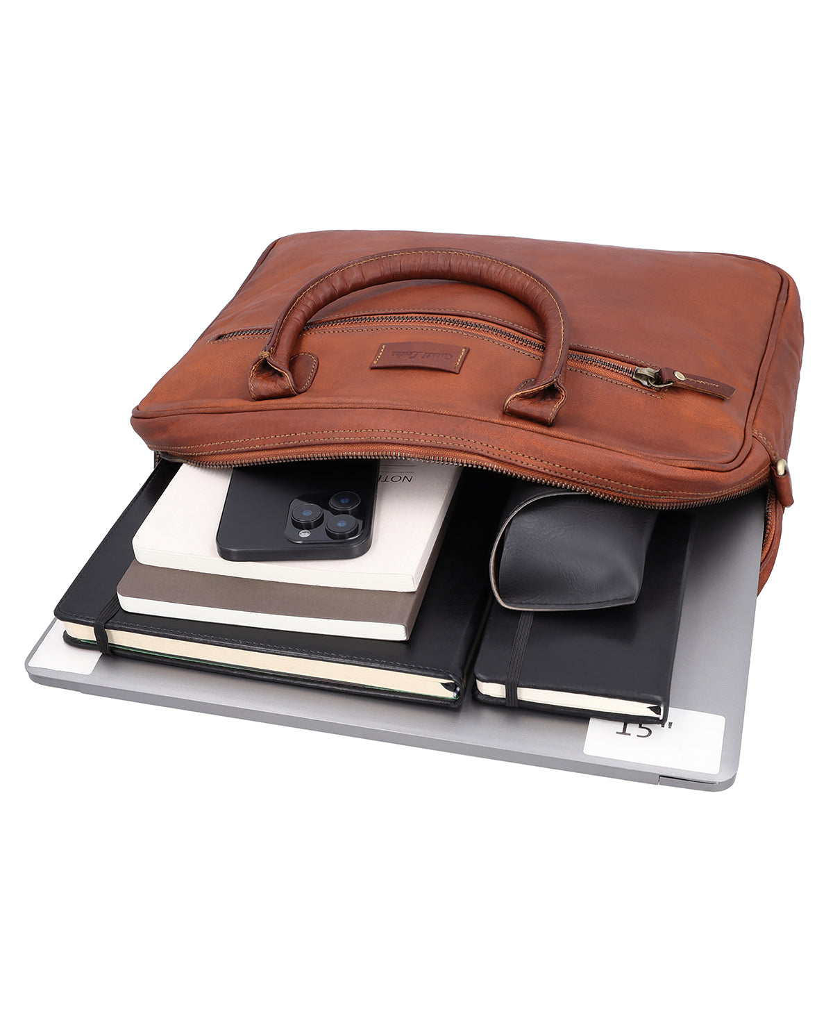 With "Cassius," you are choosing a briefcase that perfectly combines elegance, functionality, and comfort. Made from high-quality leather, it impresses with its clean lines and well-thought-out interior layout. The main compartment with zipper offers generous storage space, while the padded laptop compartment protects your computer. Inside, you will find two slip pockets, a zipper compartment, pen holders, and a removable key ring holder, so everything has its place. An integrated AirTag compartment ensures that you can always find your bag – ideal for your modern working life.