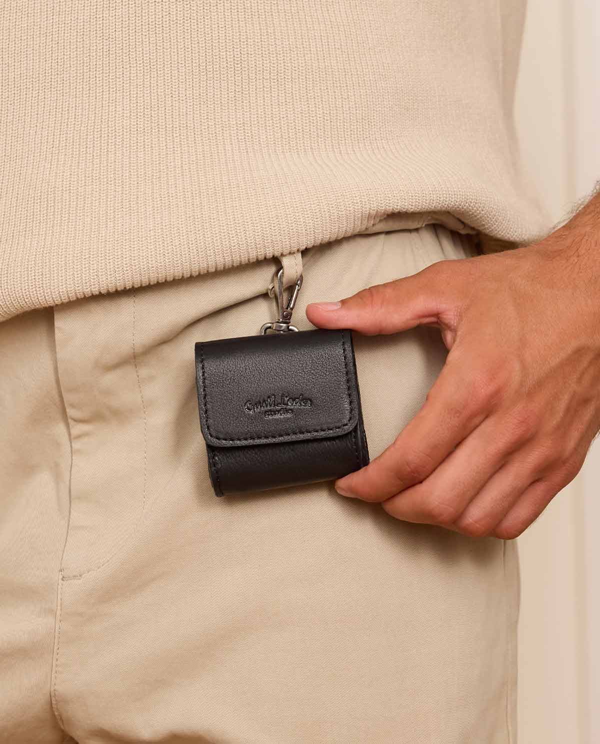 The "Andrico" protective case for your AirPods and similar headphones combines practical protection with stylish design. Made from high-quality genuine black leather, it not only protects your headphones from scratches and bumps but also gives them an elegant and timeless look. Whether you're on the go or want to safely store your headphones – the "Andrico" case is the perfect companion for any occasion.