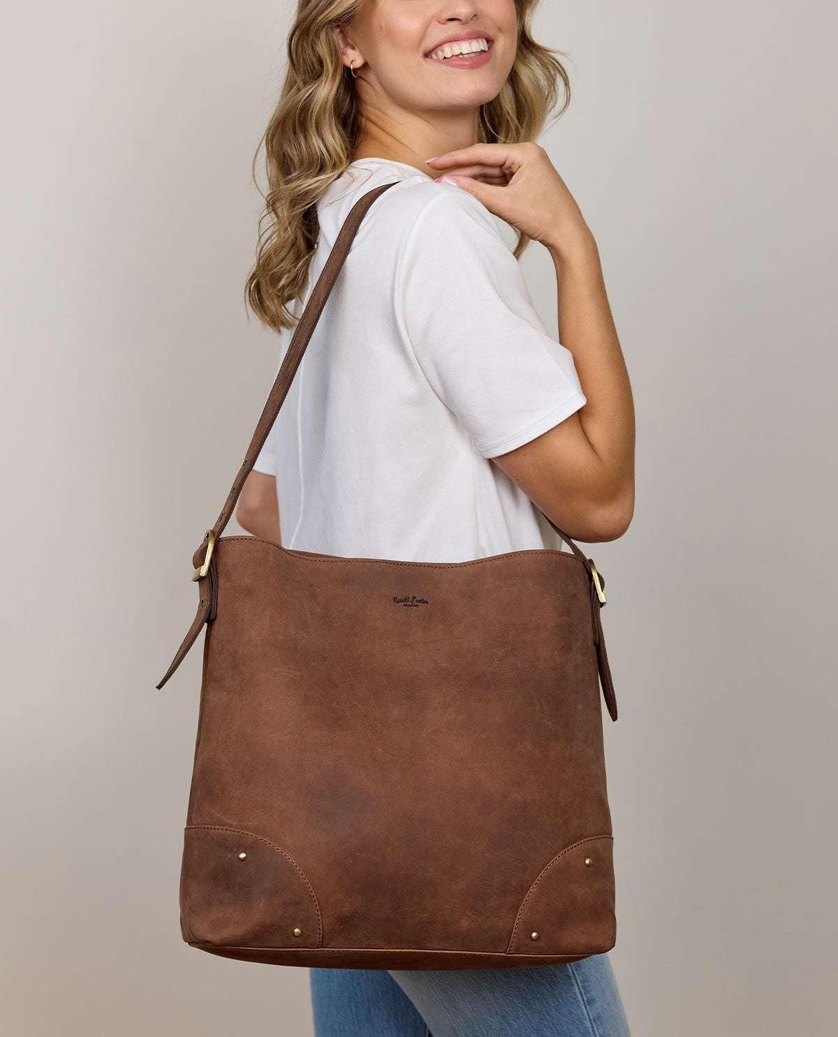 The "Moje" handbag in elegant brown combines stylish design with thoughtful functionality and is the perfect companion for every woman. The adjustable shoulder strap with brass buckle allows you to carry the bag according to your wishes – comfortably over the shoulder or across the body. With the practical magnetic closure, the contents are securely stored, while the thoughtful interior layout ensures perfect organization. The laptop compartment offers ample space for your laptop and protects it reliably. Two additional open compartments are ideal for your phone, charger, or other important small items.