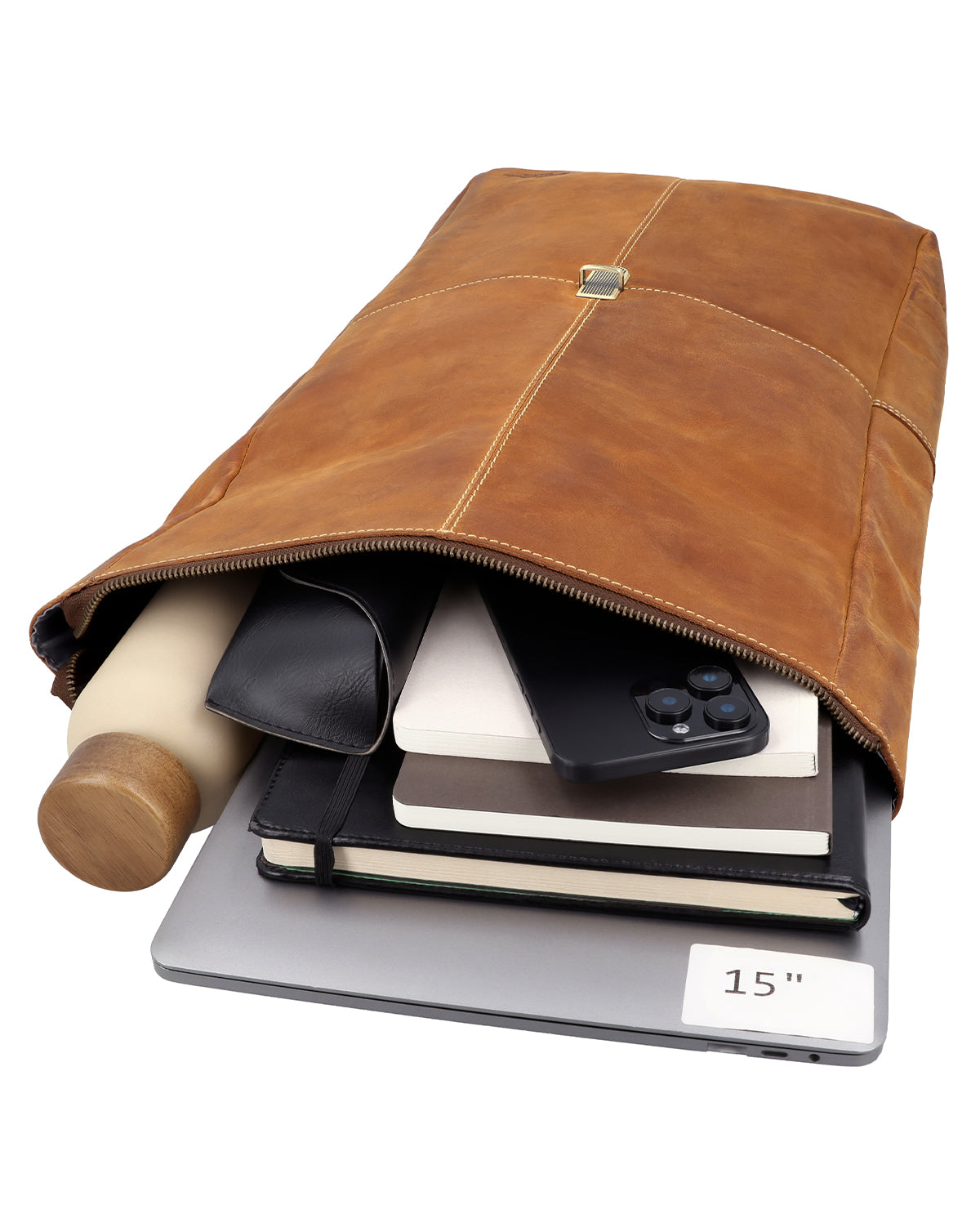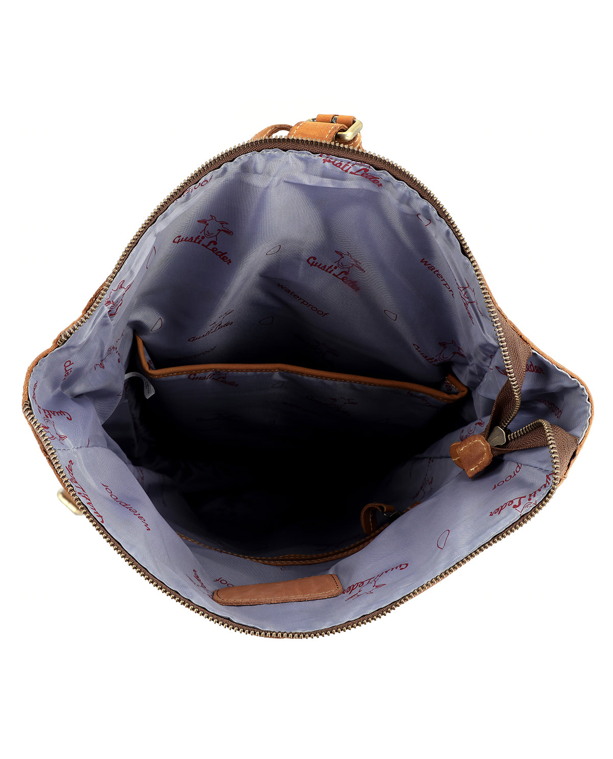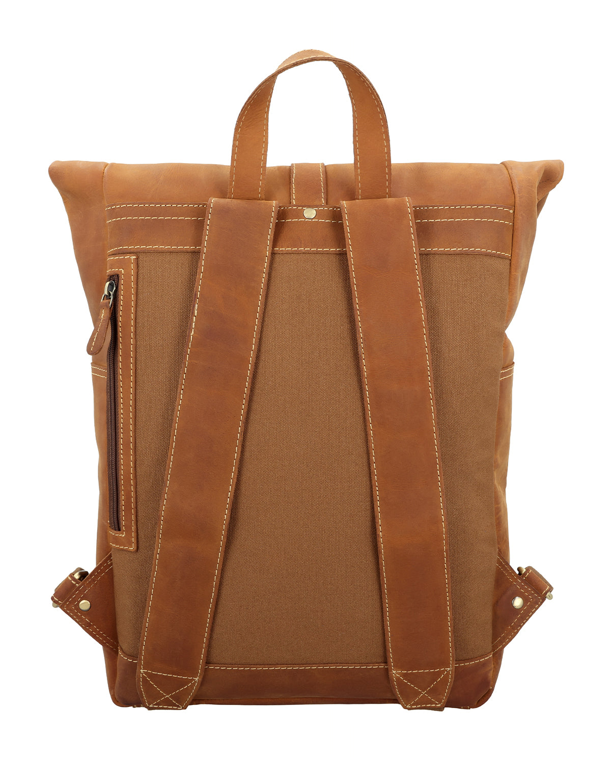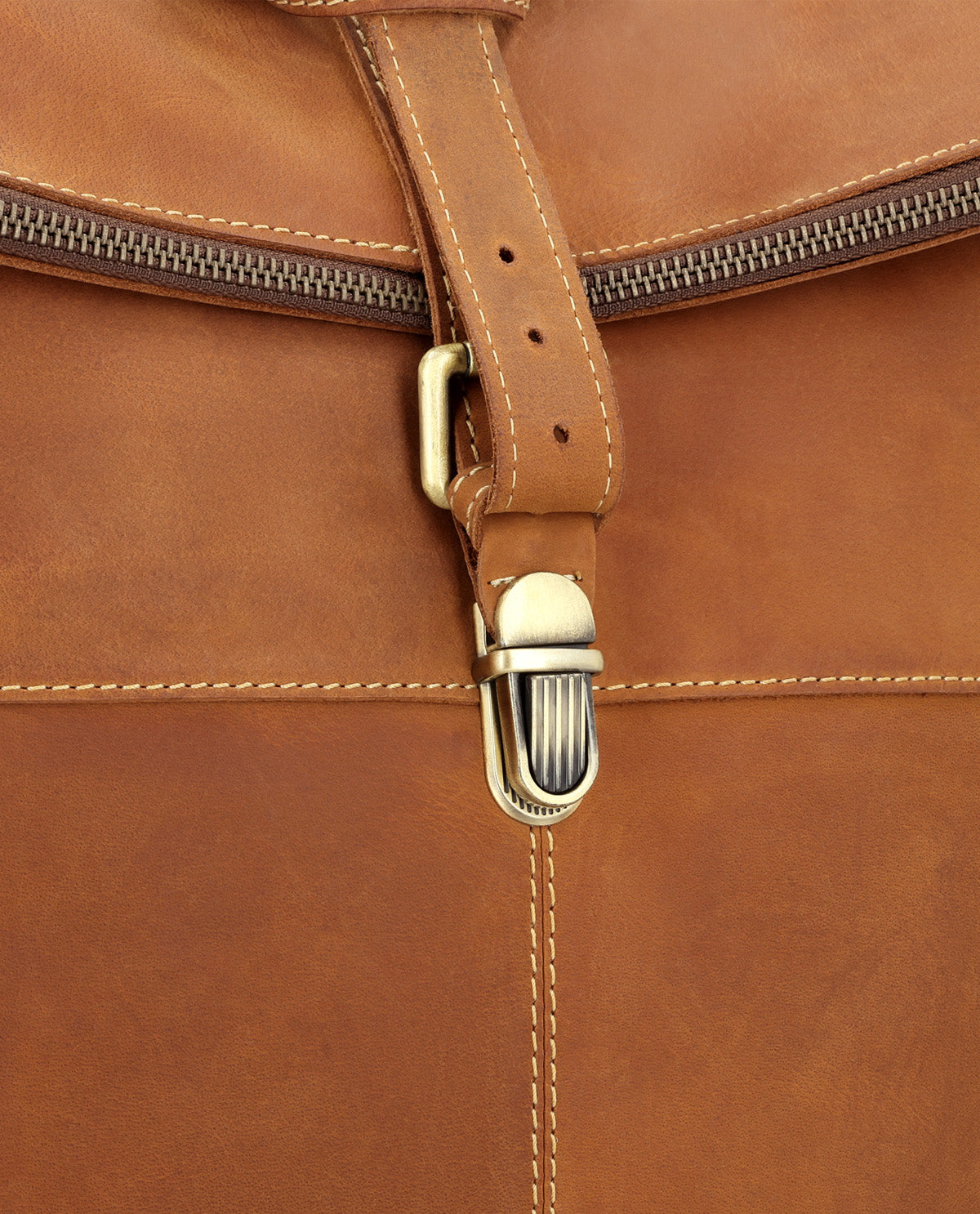 “Henning” is a medium-sized roll top backpack made of sturdy, camel brown goatskin leather that’ll help you navigate the big city maze or narrow metro lines with ease thanks to its slim cut. Its well-thought-out layout has more than enough space in the large main compartment for your A4 folders, 15” notebook, books and a large water bottle, there’s an additional zip pocket inside so that you can organise your things and find them with ease. The bright inner fabric is made of water-resistant polycotton which protects your backpack from moisture and marks, so you don’t need to worry if you have any small mishaps. The zipped pocket on the side has plenty of space for all of your belongings and the padded back section and the inner side of the wide shoulder straps are covered in brown canvas to offer you extra comfort.