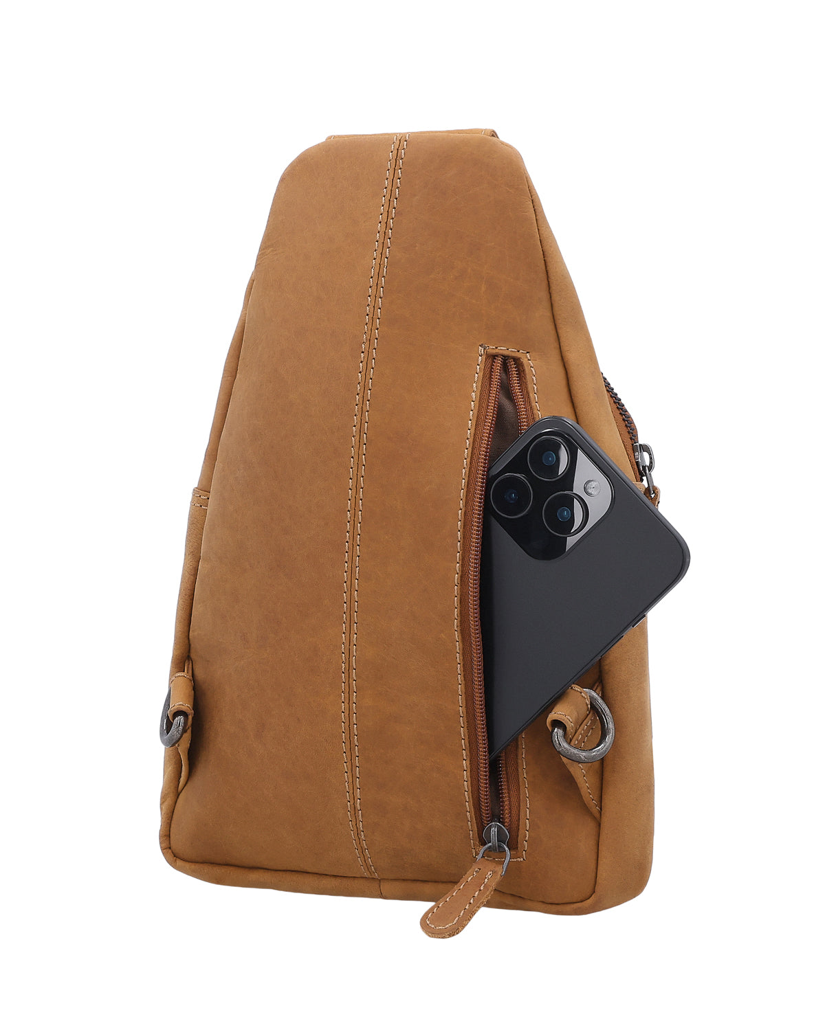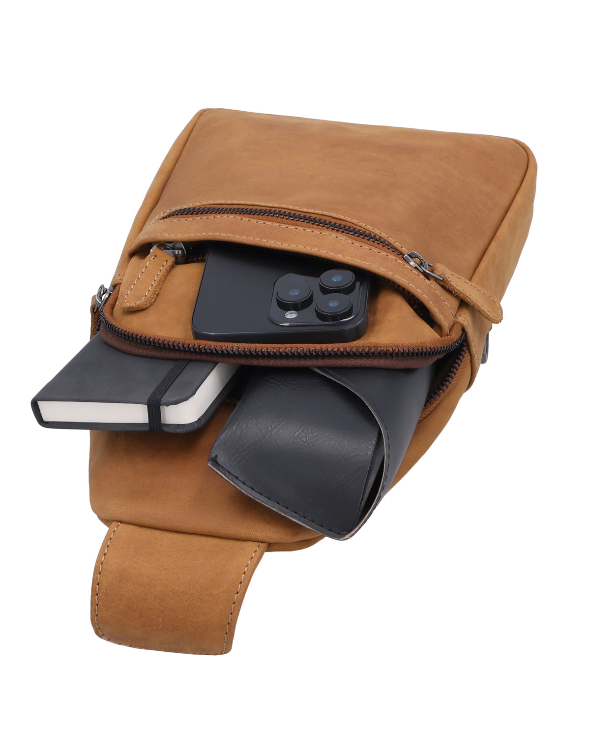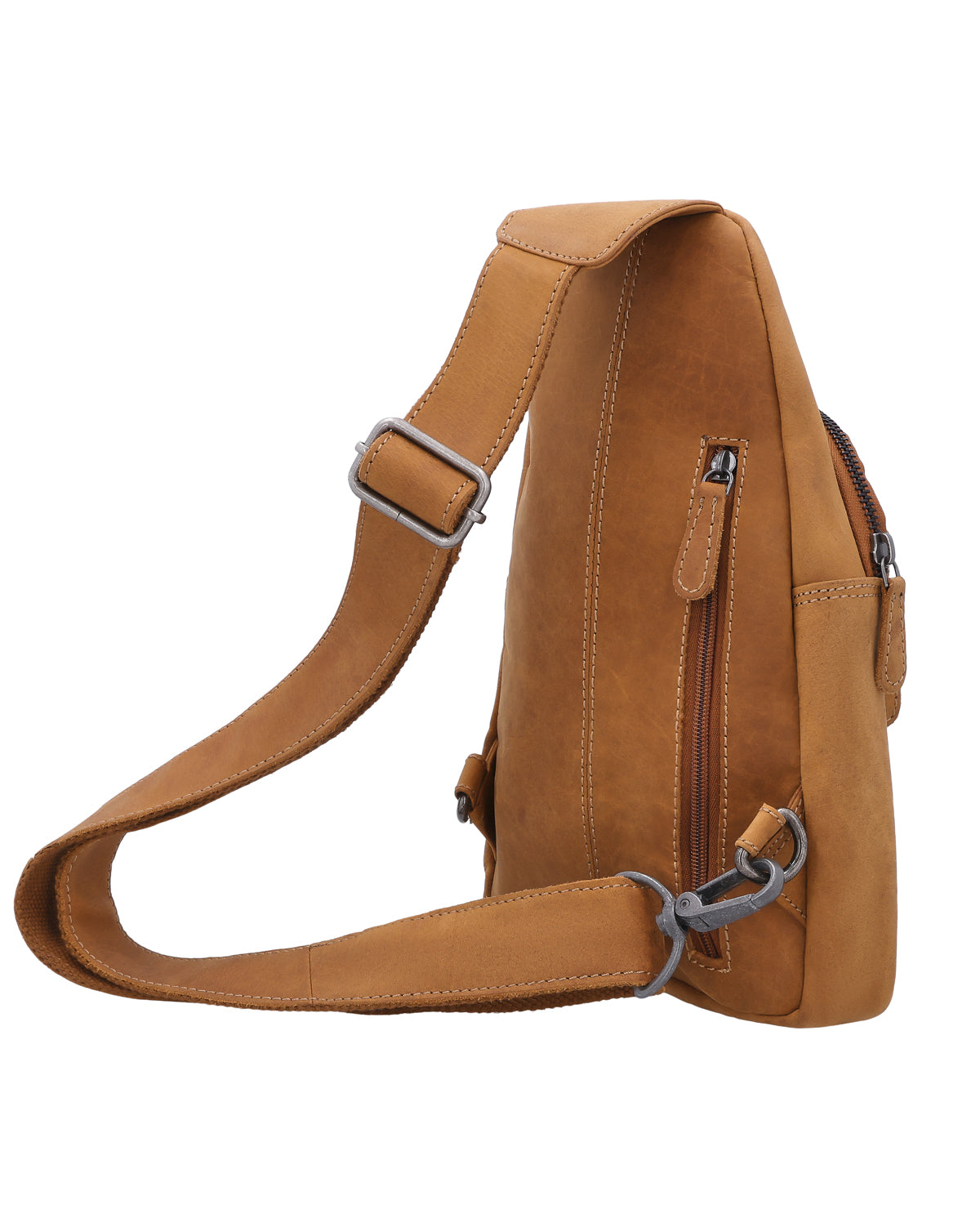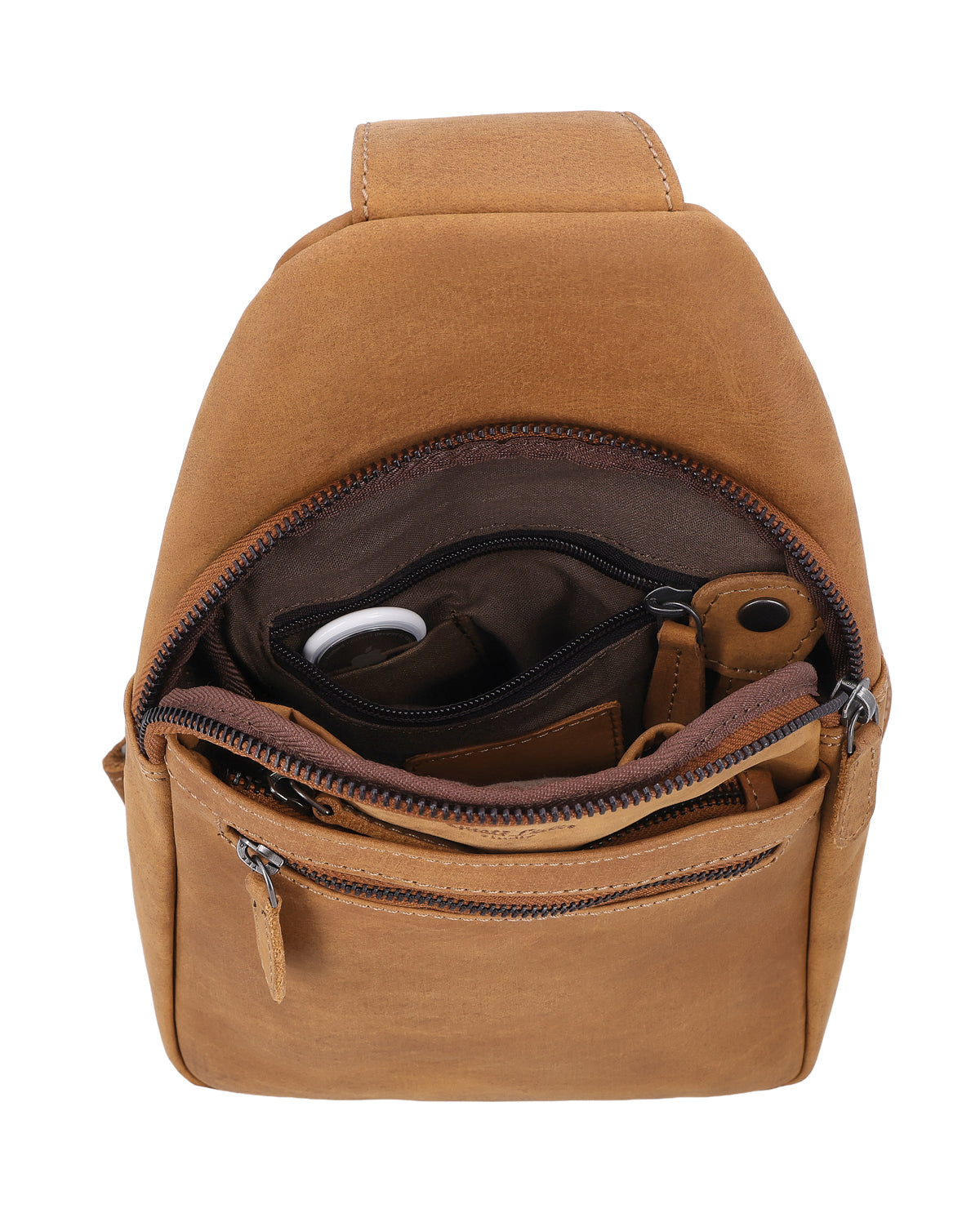 The Azon leather bag is a versatile sling pack for men that easily adapts to your everyday life. A removable key ring keeps your keys securely in place, and a hidden AirTag compartment gives you extra peace of mind when you're on the go. Two zippered compartments on the outside – one at the front and one at the back – ensure that you can store your essentials quickly and securely. There is also another zippered exterior compartment for items that you like to keep separate and handy. Whether worn as a belt bag, across the shoulder, or as a compact shoulder backpack, Azon remains flexible and comfortable, no matter how you travel. The brown leather gives the bag a natural, urban look and makes it a reliable companion for city life, travel, or spontaneous adventures.