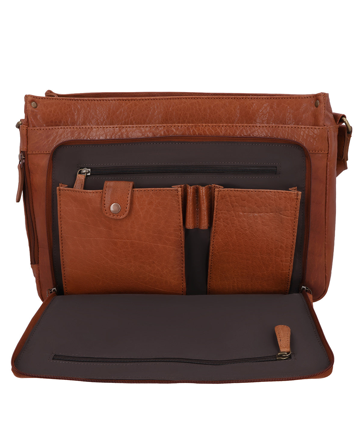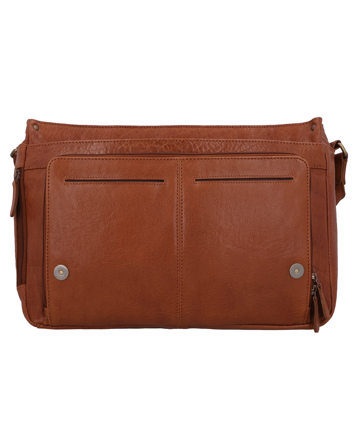 Two outer slip pockets and a large outer compartment with a zipper provide quick access to documents and accessories. Inside this compartment, several concealed zipper pockets, a snap-fastener pocket, a slip pocket, and two pen holders keep everything tidy. A separate laptop compartment reliably protects your device, complemented by a zipper pocket in the main compartment and another pocket on the back of the bag. The shoulder strap is adjustable and adapts to your everyday needs, while the magnetic closure allows for quick opening and secure closing. An engraved patch and the Gusti logo on the inside and outside round off "Florin" as a high-quality leather business bag.