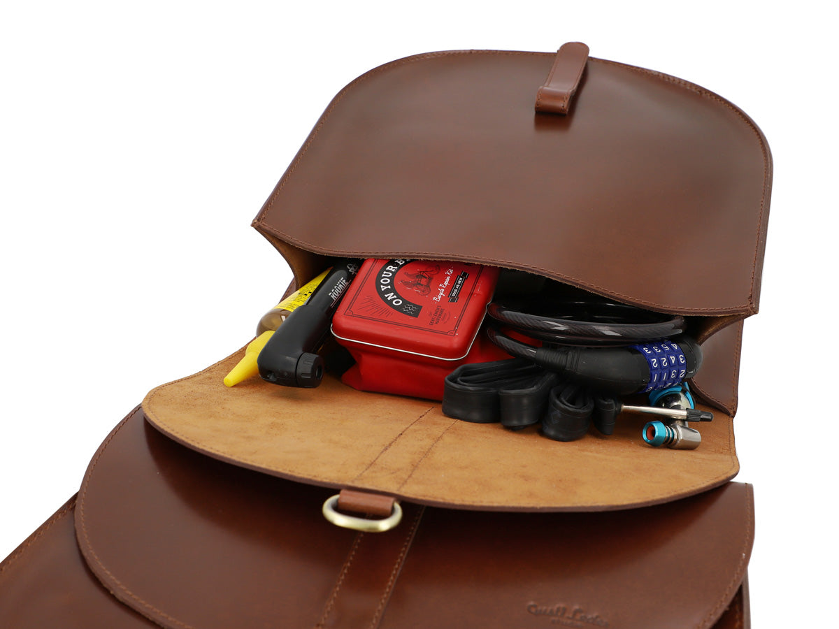 The sophisticated buffalo leather nestles discreetly against your bike, ensuring nothing gets in the way of your journey from A to B. Keys, water bottle, cell phone, bike lock, wallet, and much more – "Victor F." has room for everything with its large main compartments. It closes with gold buckles, ensuring your belongings are well protected and nothing can fall out. If you want to combine eccentricity with functionality, try "Victor F." Due to the natural manufacturing process, color variations may occur with our Gusti Leder nature favorites.