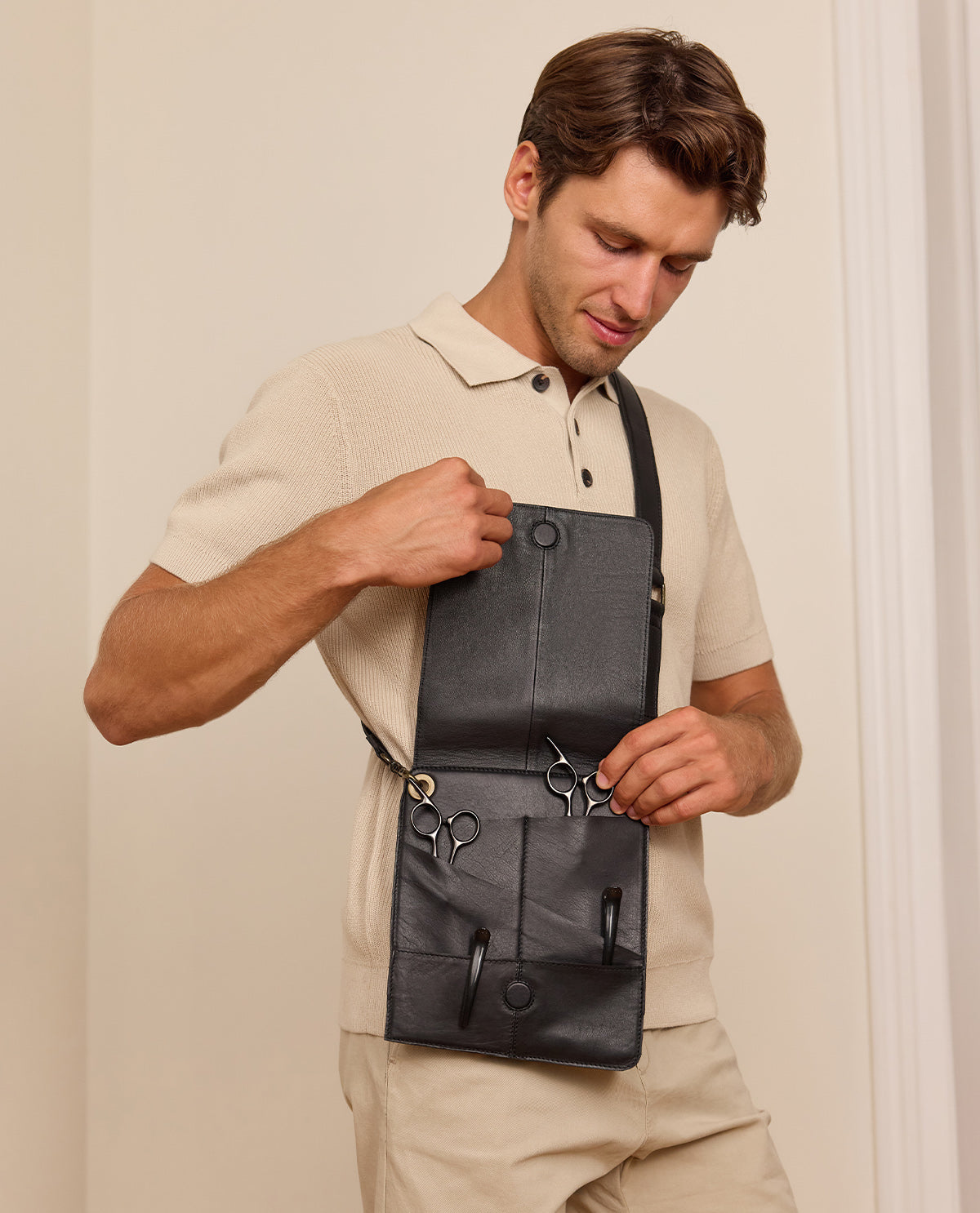 Our leather stylists bag "Moana" will impress you with her stylish design as well as her well-thought-out pocket system inside. Keep your scissors, comb, and brushes safe and organised in the series of pockets. This bag will last a lifetime and is easy to clean thanks to the timeless, sturdy, black leather. It's perfect for daily use in the salon or when you're working from your customers' homes.