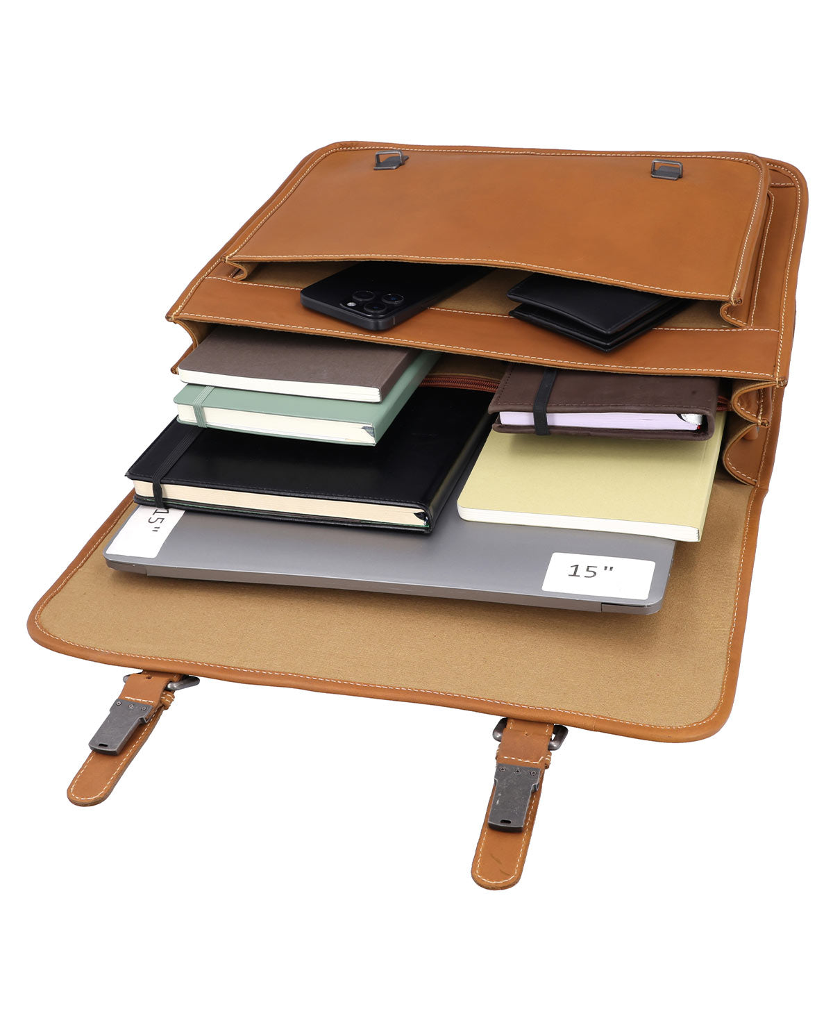 "Elmar" and its spacious, centrally divided main compartment easily accommodate DIN A4 folders and document files of any kind, as well as the appointment calendar, writing utensils, lunch package, a small water bottle, and much more. Technical devices up to a size of 15" meanwhile find space in a specially integrated laptop compartment in the bag design. The centrally inserted zipper compartment and the various slip pockets and the attached pocket on the front of "Elmar" also offer the possibility to store smaller belongings within easy reach without having to search for them for long. The length-adjustable and detachable shoulder strap allows you to ideally adapt "Elmar" to your individual carrying habits, while two snap closures in a buckle look ensure that everything is protected from dust and moisture on the go.