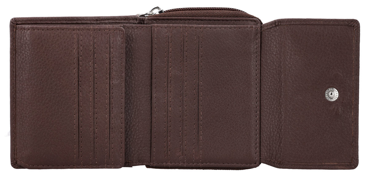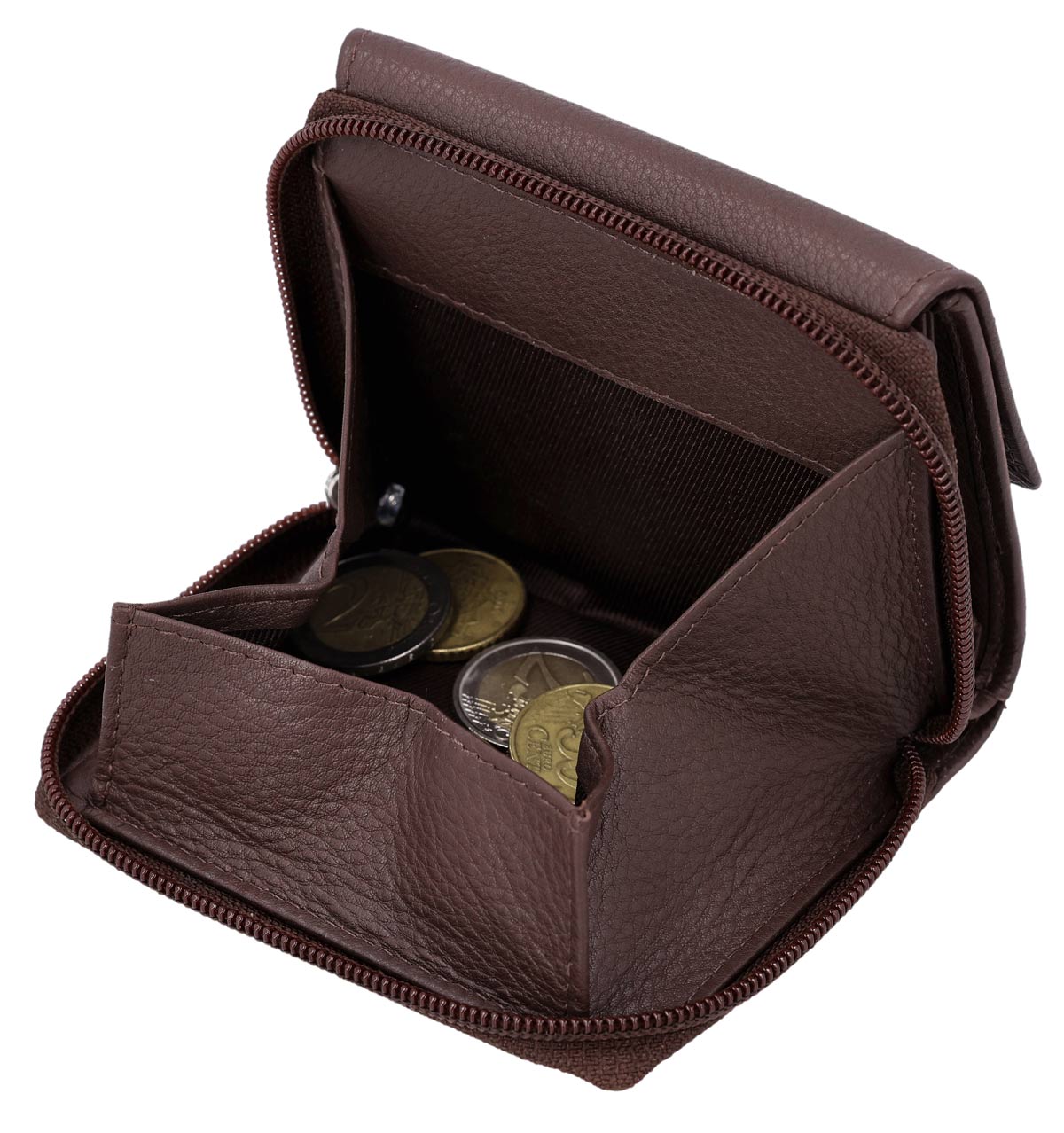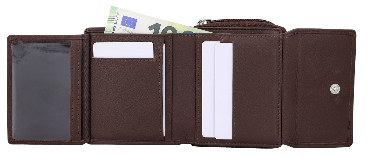 À l'intérieur de "Brigitta", vous trouverez un compartiment pour billets, une fenêtre dépliable, de la place pour jusqu'à six cartes ainsi qu'un compartiment à monnaie séparé avec fermeture éclair, qui empêche de manière fiable les pièces de tomber. La fermeture à bouton-pression en cuir de haute qualité maintient le tout en sécurité. Avec le bloqueur RFID cousu, les signaux de vos cartes sont bloqués, de sorte que les personnes non autorisées n'ont aucune chance de lire vos données. Un portefeuille compact, élégant et sûr pour chaque jour.