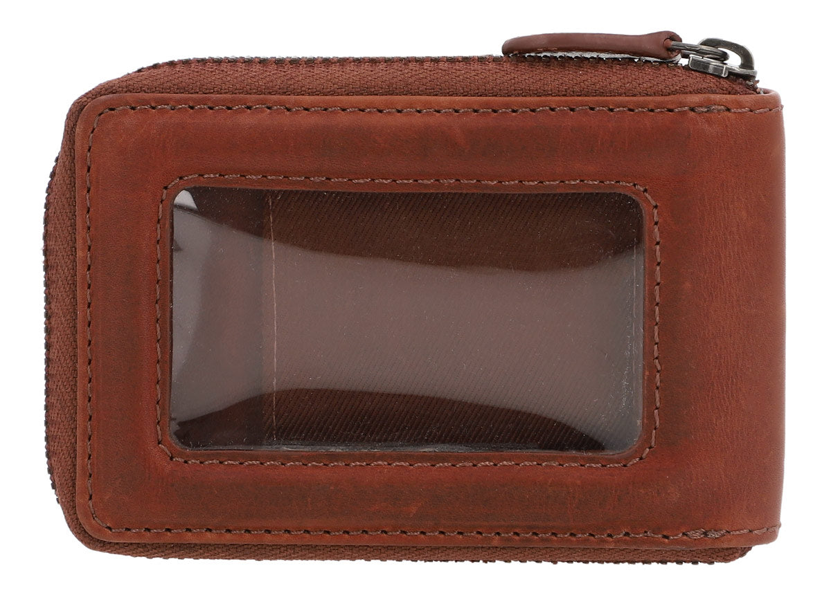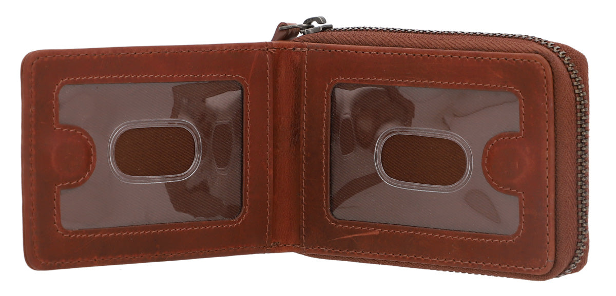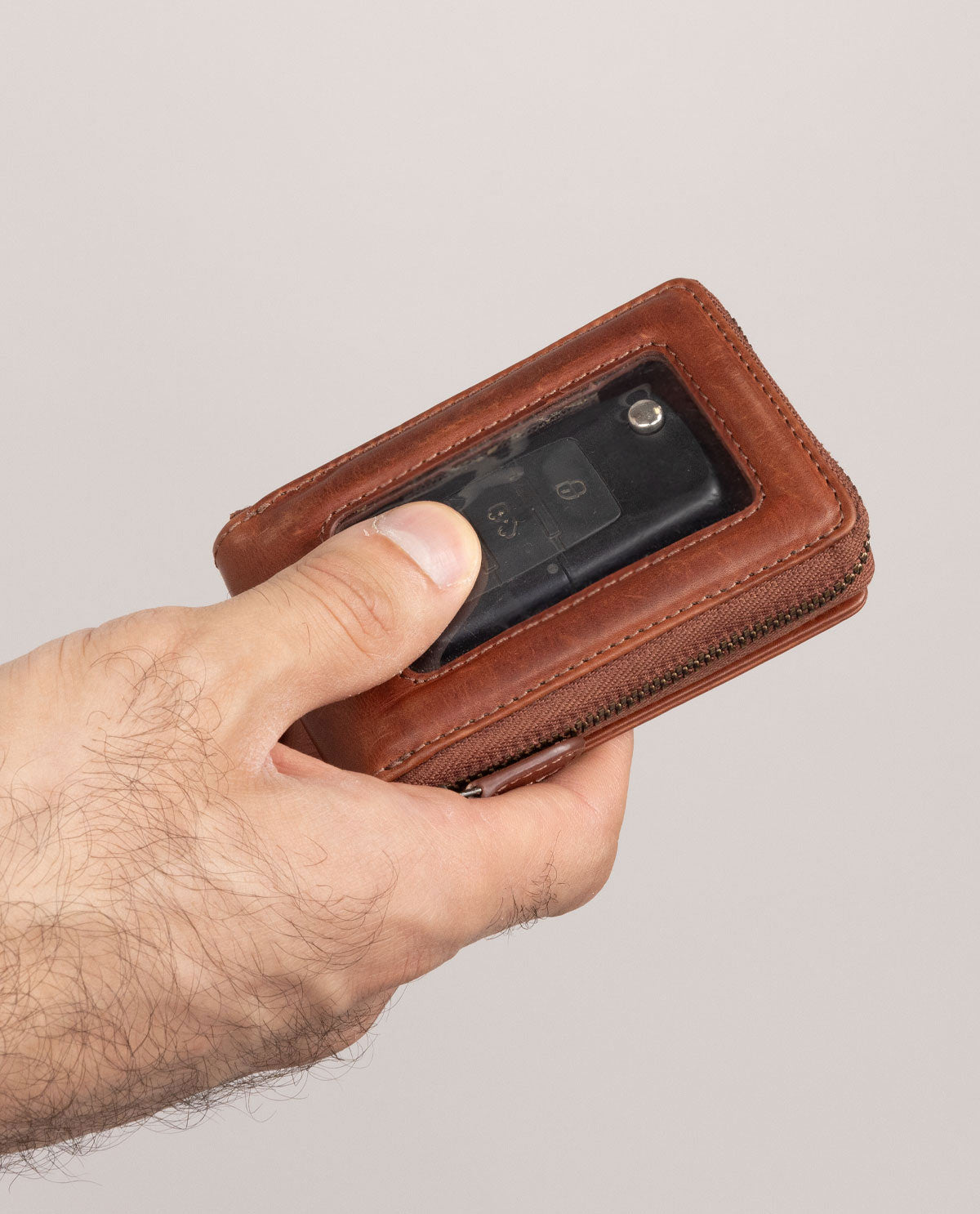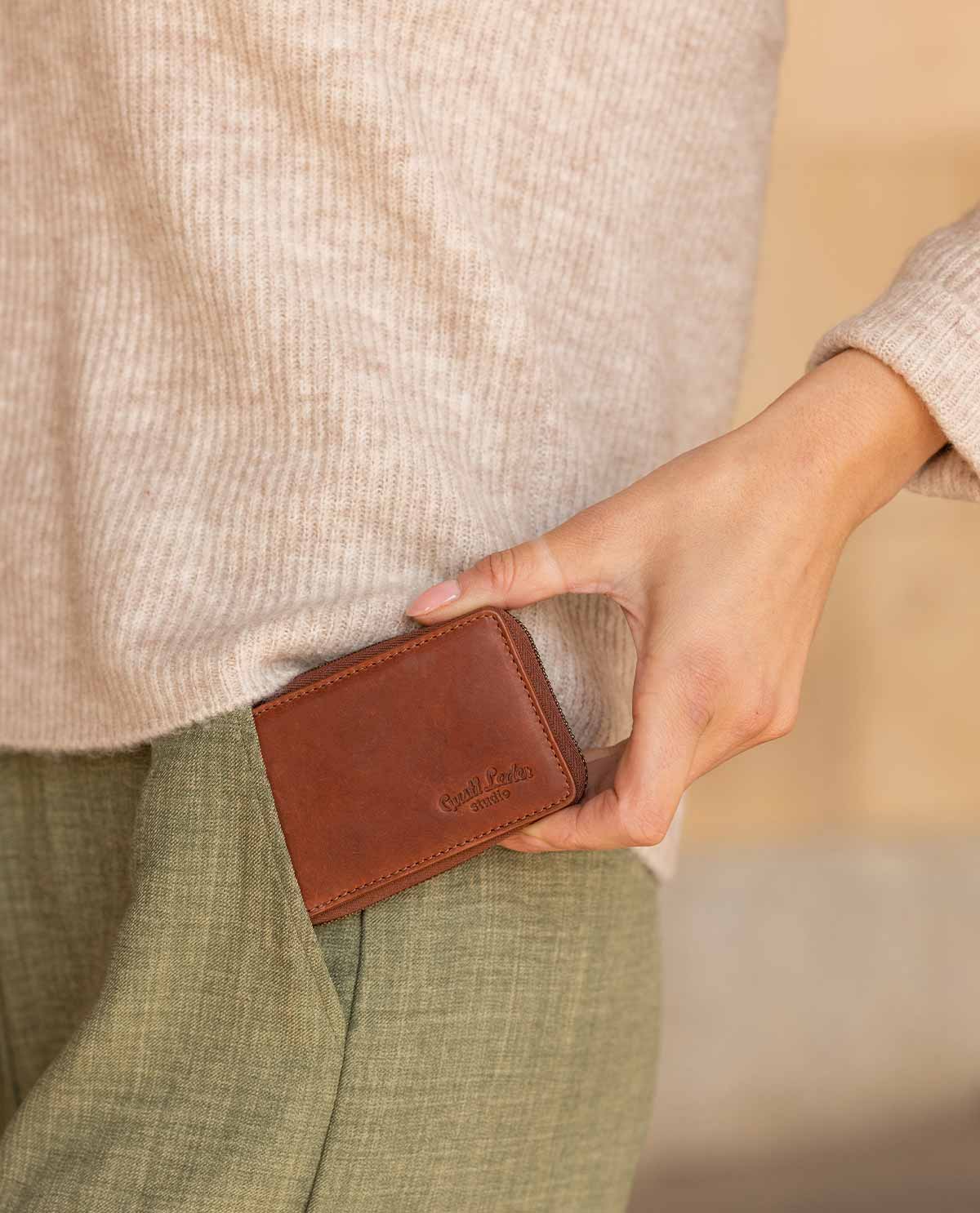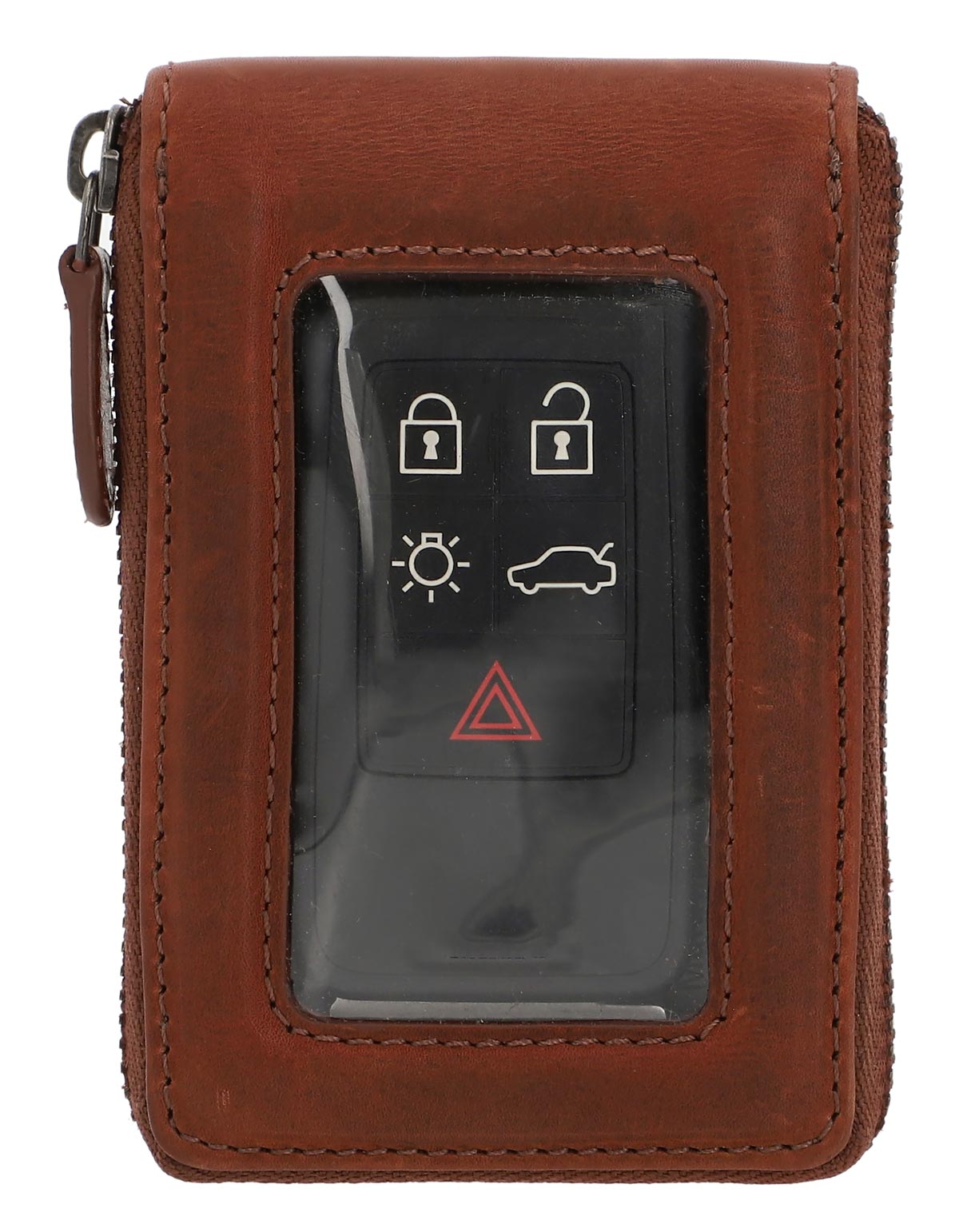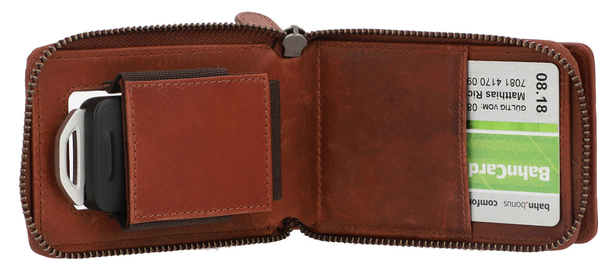 Ce portefeuille en cuir marron se distingue par son design élégant et compact. Il est idéal pour les adultes qui se déplacent en voiture. La fermeture éclair est située au centre et permet un accès rapide aux cartes et aux clés de voiture.