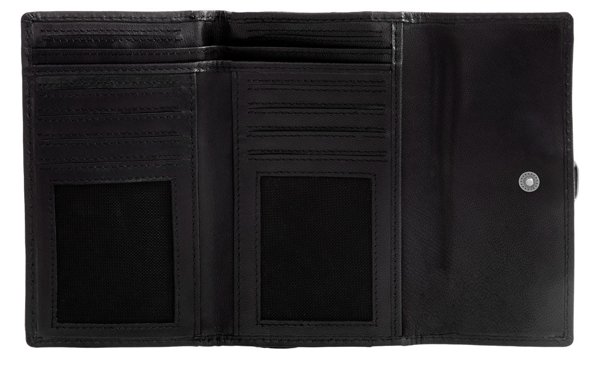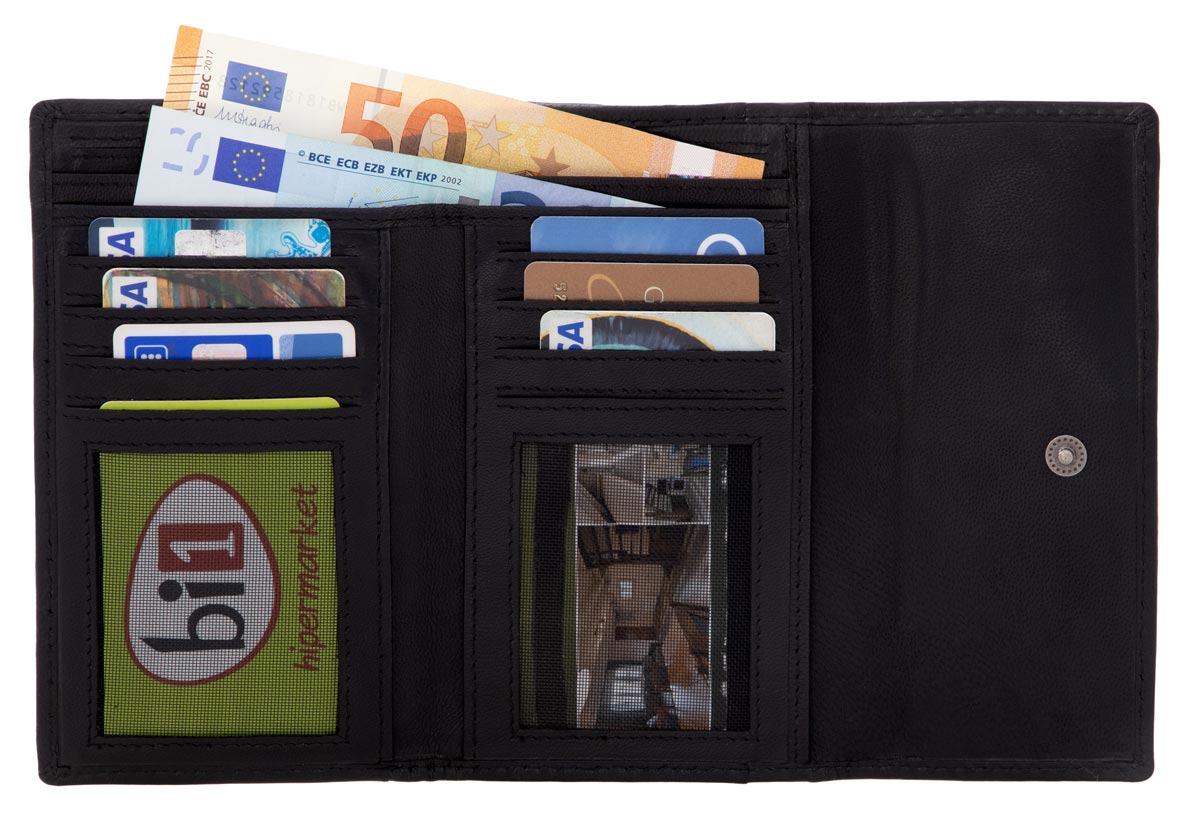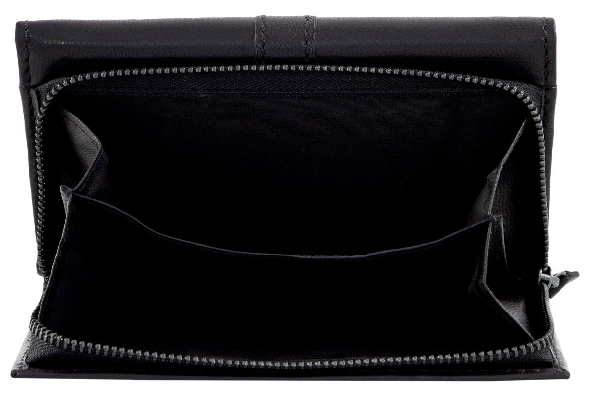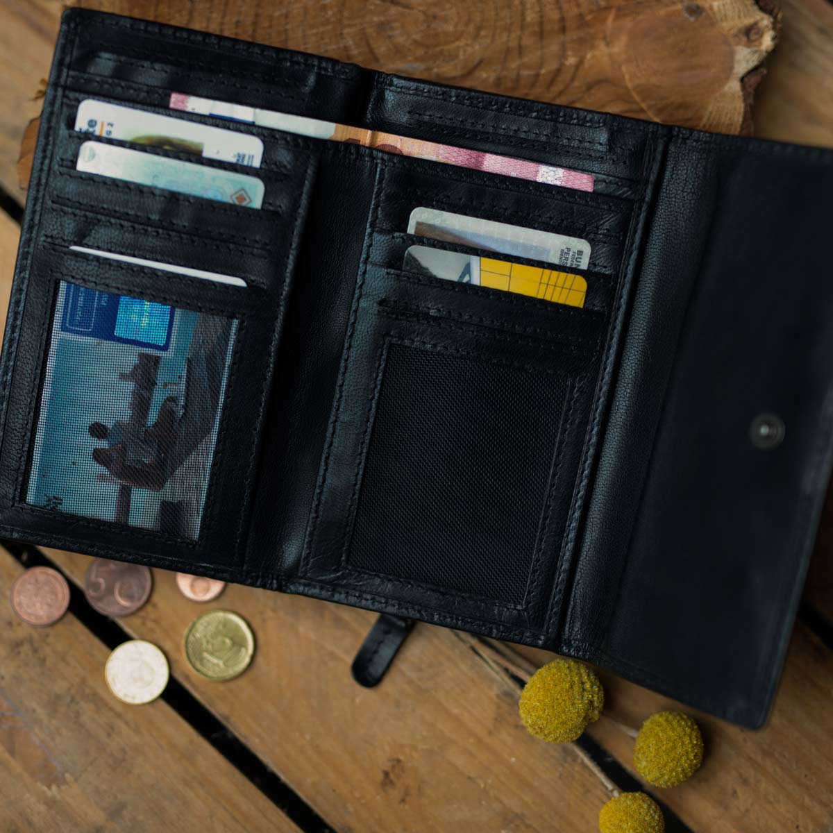 À l'intérieur, "Mae" impressionne avec un système d'organisation très bien structuré composé de deux compartiments pour billets, d'un double compartiment à pièces séparé, qui peut être ouvert par une fermeture éclair, et au total de 8 emplacements pour (au moins) autant de cartes. Deux compartiments latéraux intégrés augmentent encore l'espace de rangement du portefeuille, tout comme les deux fenêtres transparentes, où l'on peut facilement ranger une pièce d'identité, un permis de conduire ou même des photos de ses proches.