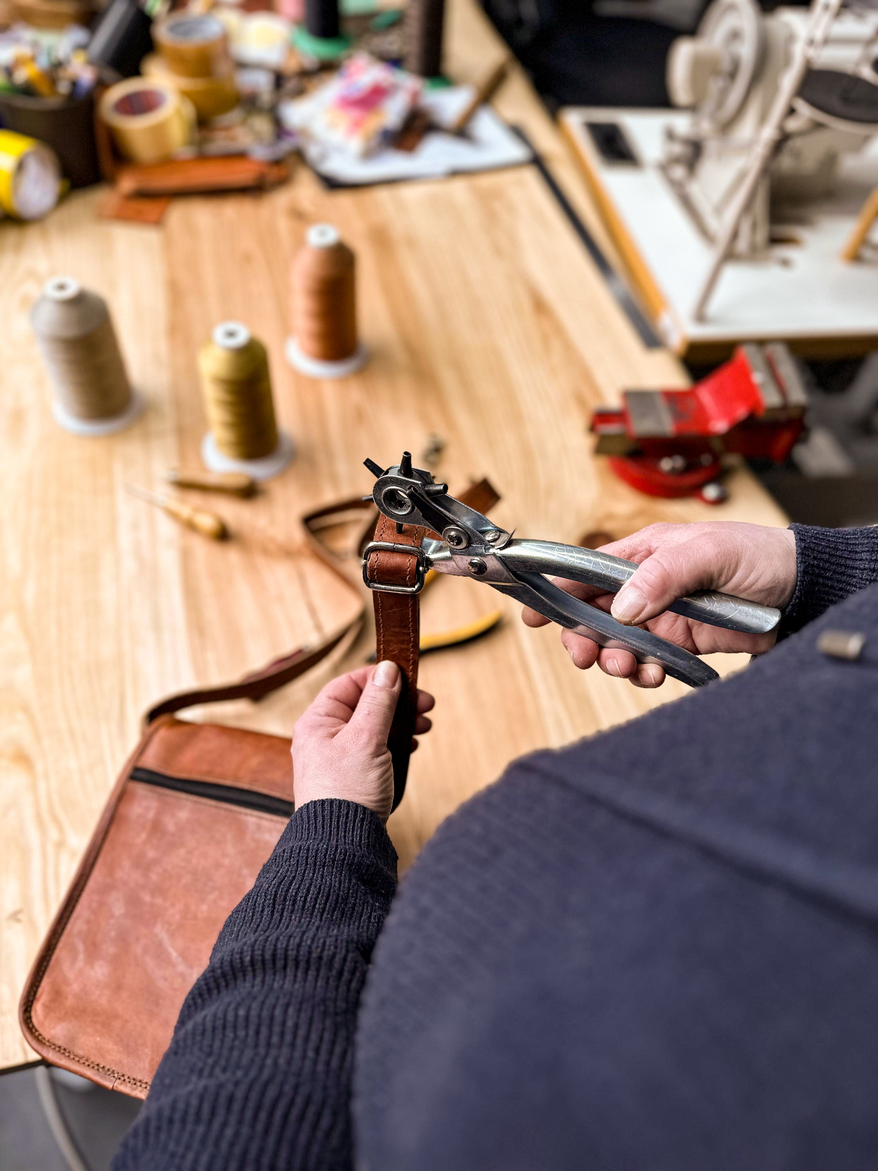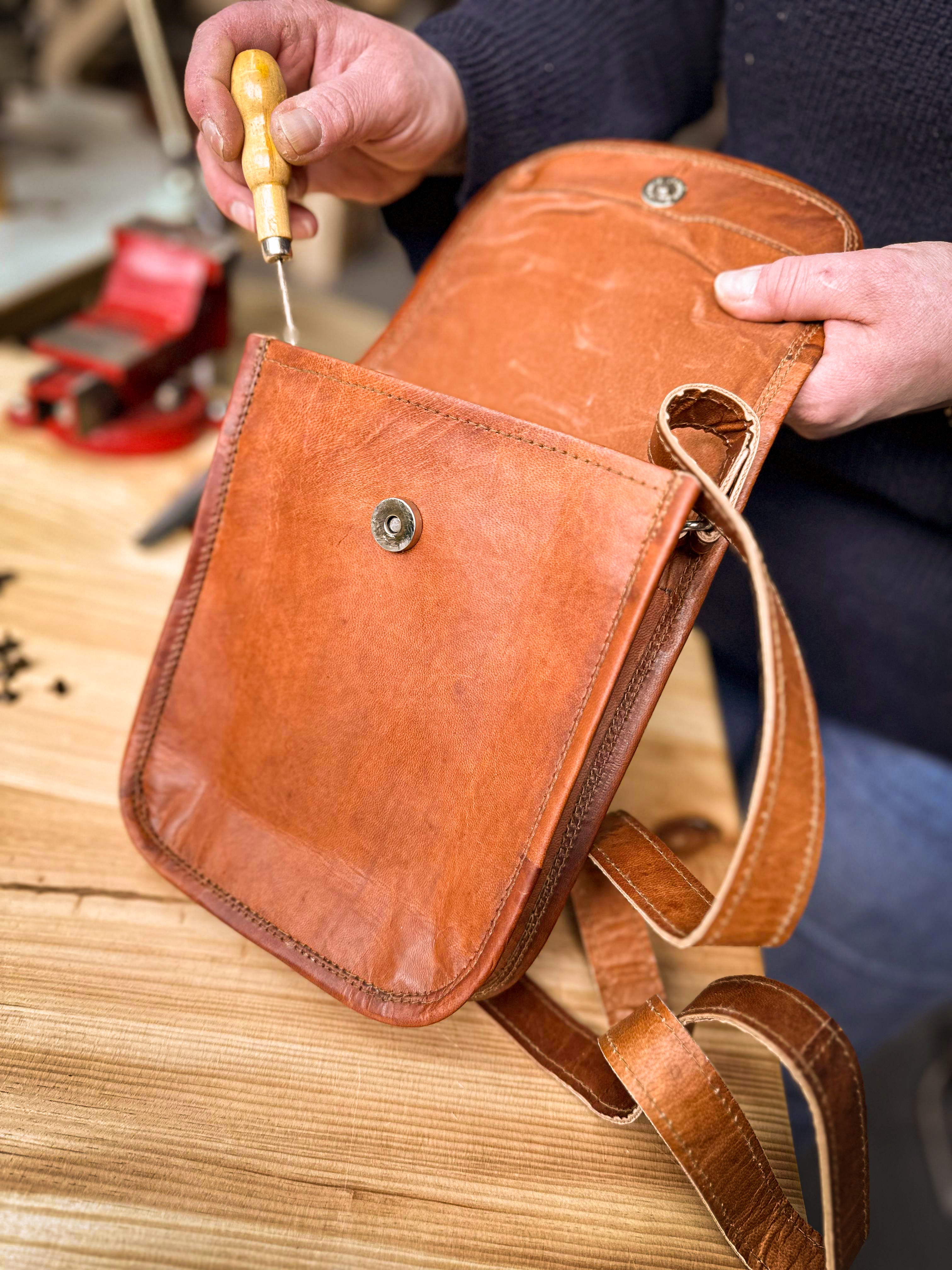 Da noi ogni borsa in pelle è benvenuta per una riparazione. Non accettiamo scarpe in pelle o altri capi di abbigliamento. Inoltre, non possiamo offrire riparazioni con parti originali, poiché lavoriamo solo con i materiali di ricambio del nostro assortimento. Tuttavia, potete portare i vostri materiali di ricambio come fibbie o moschettoni e li invieremo insieme alla vostra borsa. Per questo motivo, i prezzi vengono determinati individualmente in base alla riparazione.