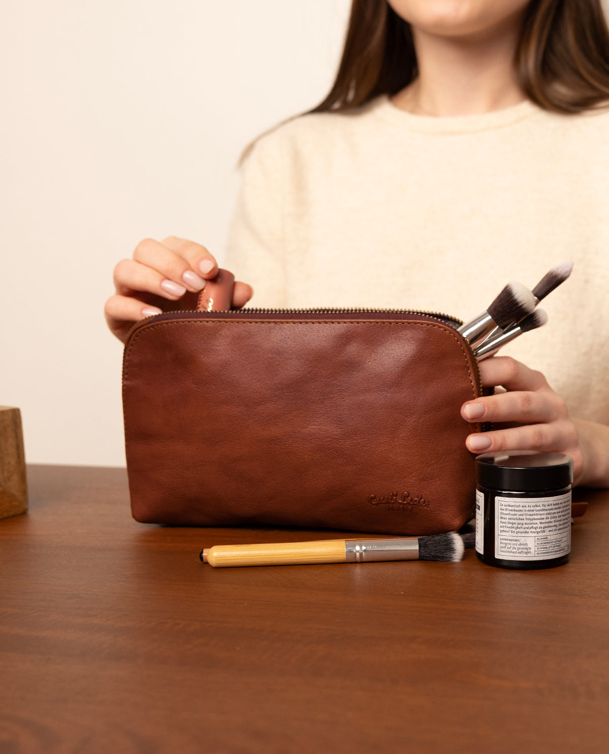 Che tu sia un viaggiatore d'affari o un turista, per un viaggio improvviso o per tenere in ordine il tuo trucco, "Eli" unisce la praticità a un look vintage e disinvolto. La pelle di bufalo di alta qualità e le dimensioni pratiche non solo ti aiutano a organizzare tutto alla grande, ma rendono questo beauty case anche un accessorio di stile. La pratica cerniera e il design ben studiato offrono spazio a sufficienza per tutti i tuoi prodotti per l'igiene, come deodorante, shampoo, balsamo, dentifricio e molto altro. Per una maggiore praticità nell'uso quotidiano, "Eli" ha una fodera interna idrorepellente, così è più facile tenerlo pulito. Ispirato a Berlino, "Eli" è il compagno perfetto per chi ama la funzionalità e lo stile.