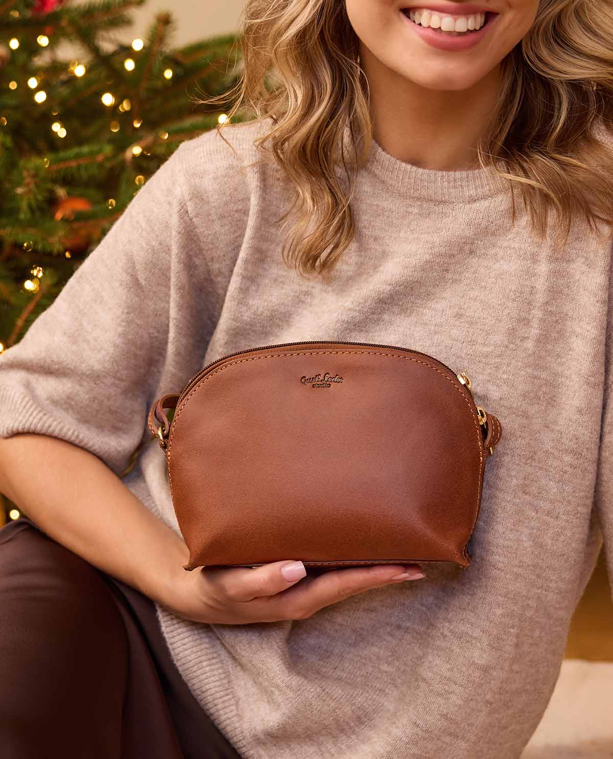 Questa borsa alla moda in robusta pelle di bovino marrone unisce, grazie alla sua forma semicircolare con il fondo piatto e la vistosa cerniera dorata a due vie, come poche altre, contrasti stilistici, garantendo che "Tilda" possa essere sempre perfettamente abbinata e adatta a tutte le occasioni. Un ulteriore vantaggio in termini di sicurezza: una tasca con cerniera integrata nella fodera interna a righe della borsa per chiavi, smartphone o il piccolo portafoglio – per un po' più di sicurezza e protezione ottimale dei tuoi beni dai borseggiatori.