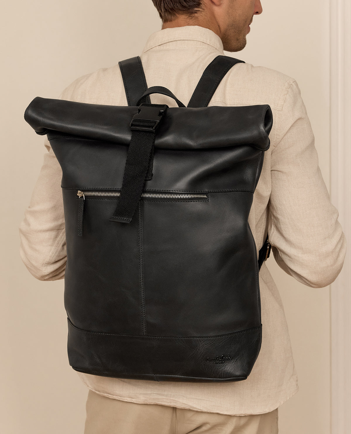 Ob für Schule, Uni oder Arbeit – unser Rolltop-Rucksack "Mattis" passt einfach immer. Denn er weiß mit seiner Flexibilität, seinem hohen Tragekomfort und Platzangebot zu überzeugen. Dieser klassisch-robuste Daypack aus schwarzem Büffelleder fällt dabei vor allem durch sein trendiges Rolltop auf – ein Look, an dem man momentan einfach nicht vorbeikommt.